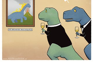 Zwei elegant gekleidete Dinosaurier in schwarzen Anzügen stehen in einer Kunstgalerie. Sie betrachten ein gerahmtes Gemälde an der Wand. Das Bild zeigt…