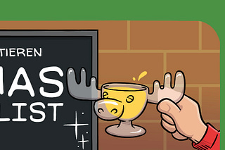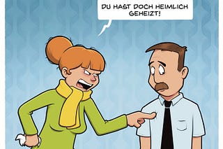 Eine Comiczeichnung zeigt eine Frau mit gelben Schal, verschnupfter Nase und Taschentuch in der Hand. Sie ist wütend, zeigt mit dem Finger auf ihren…