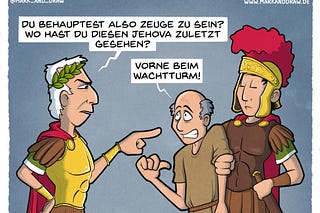 Ein Cartoon zeigt eine Szene im antiken Rom. Links steht ein römischer Feldherr mit goldenem Brustpanzer und rotem Umhang. Rechts steht ein römischer…