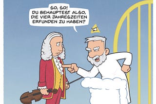Ein Cartoon zeigt eine Szene vor dem Himmelstor. Der Komponist Antonio Vivaldi steht vor Gott. Der sieht den Komponisten misstrauisch an und sagt: "SO…