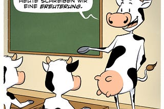 Ein Cartoon zeigt ein Klassenzimmer voller Kühe. Eine Kuh mit großem Euter steht als Lehrerin vor einer grünen Tafel. Sie beginnt ihren Unterricht und…