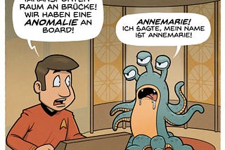 Cartoon, der im Transporterraum des Raumschiffs Enterprise spielt. Auf der linken Seite des Cartoons, hinter der Transporter-Konsole, steht ein Offizier…