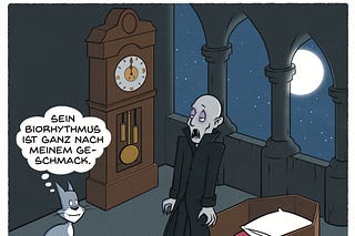 Ein Cartoon In einer düsteren, nächtlichen Schlosskulisse. Durch ein gotisches Spitzbogenfenster scheint der Vollmond. Eine große Pendeluhr zeigt…