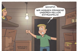 Cartoon: Ein Mann steht in seinem Keller. Um ihn herum stapeln sich Kisten. Er ruft: „SCHATZ! WIR MÜSSEN DRINGEND UNSEREN KELLER ENTRÜMPELN!“ Die Kisten…